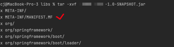 에러 메시지가 발생하면, build/libs 내부의 .jar 파일을 압축해제해서 Meta 파일에 정상적으로 MainClass가 지정되어있는지 살펴보면 된다. tar -xvf로 .jar 파일의 압축을 풀 수 있다.