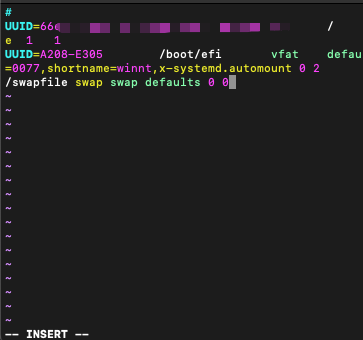 # /etc/fstab을 편집해서 부팅 시 스왑 파일 활성화