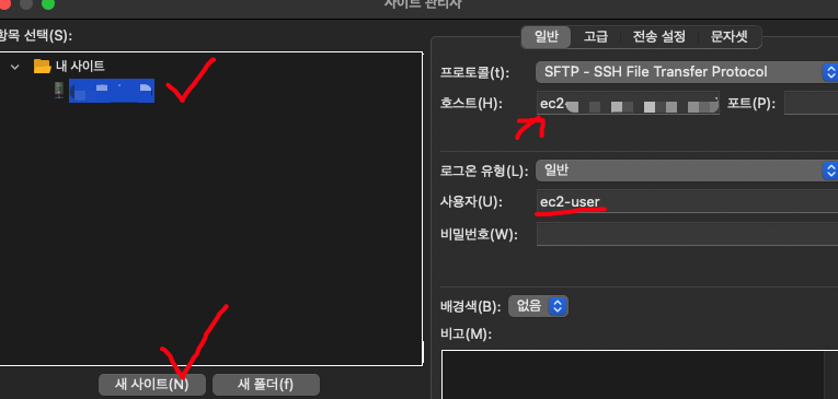 - 새 사이트 -> 이름 설정 -> SFTP 프로토콜 -> 호스트 및 사용자란을 입력하면 된다. 이 내용들은 EC2에 보면 나와있고, 사용자명은 ec2로 접속했을 때 cd ~ 명령어로 사용자 루트 경로로 이동해서 알 수 있다. (ubuntu 기반 OS가 아니면 ec2-user로 설정되어있다)