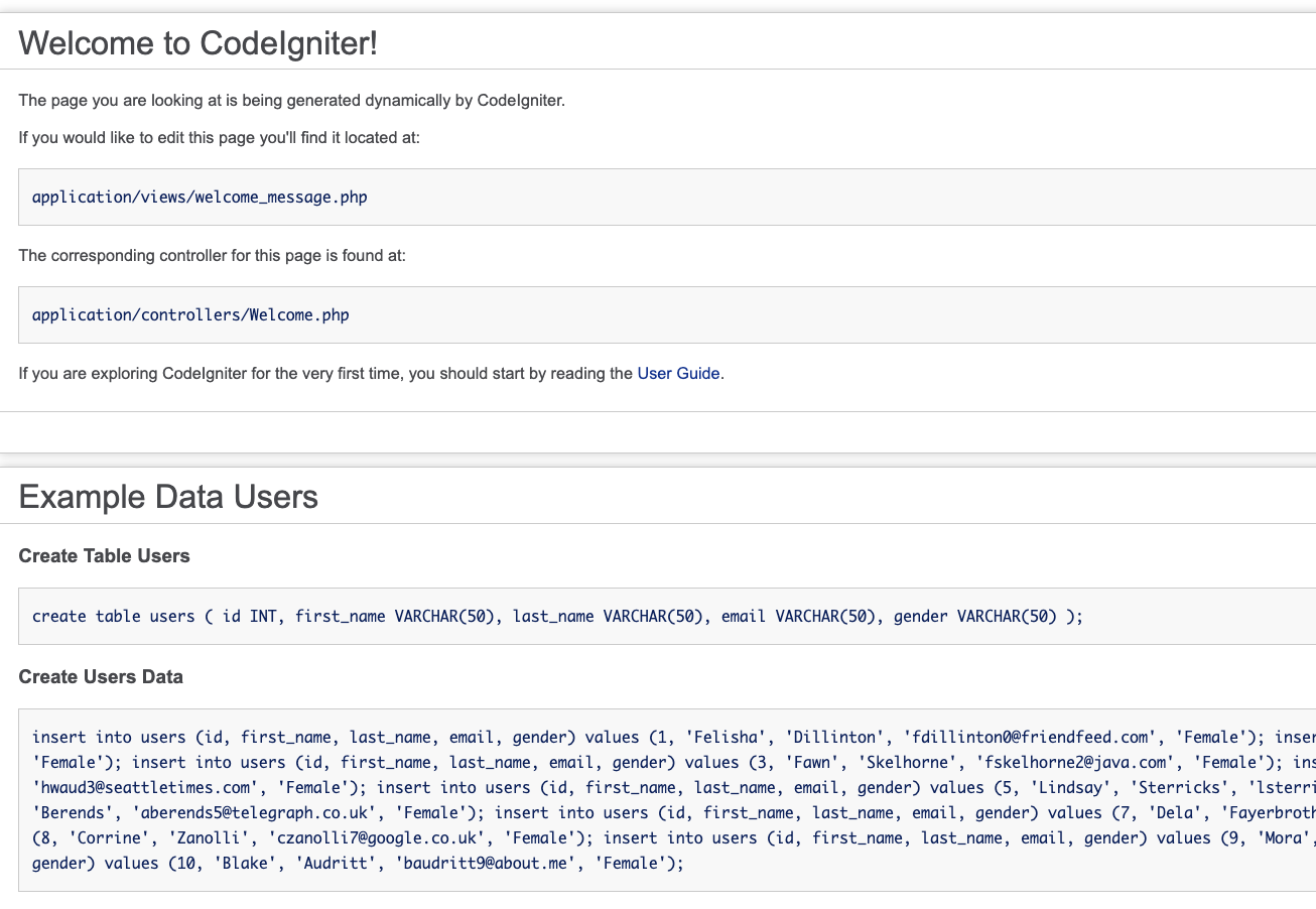 위에서 살펴본 Welcome.php controller의 index() 메서드에는 welcome_message, users라는 이름을 갖는 view를 불러오도록 되어있으므로 아래와 같은 화면이 출력된다.