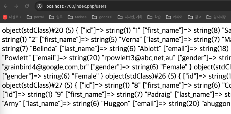 index.php/users에 접속하면 users에 넣어둔 데이터들이 잘 출력되는 것을 볼 수 있다.