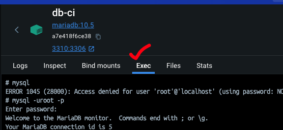 다만 접속 시, users 테이블이 없다고 나와서 docker desktop으로 직접 container에 접속하여 다음 명령어들을 입력해줬다.