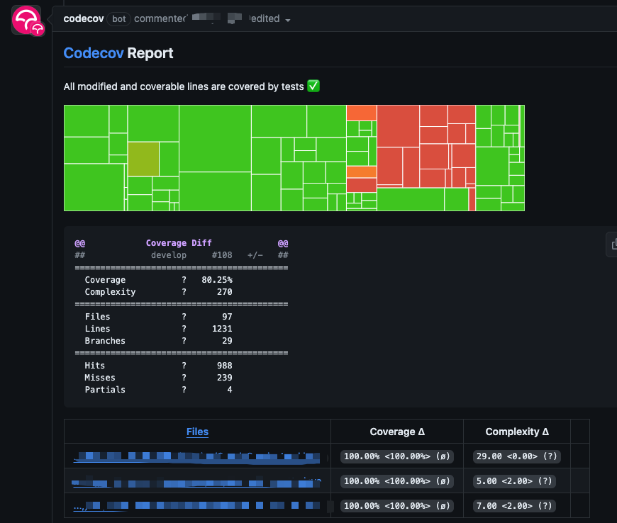 다음은 github PR에 codecov가 자동으로 comment를 남겨주는 예시이다.
