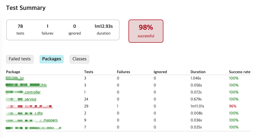 gradle로 build를 하고나면 build/reports/tests/test/ 디렉토리에 index.html 이라는 coverage report를 만들어준다. 아래 사진 처럼 각 패키지별, 클래스별로 테스트 수, 성공/실패 여부, 성공률 및 자세한 내용을 알려준다. 세부 내용으로 들어가면 앞서 말한 바와 같이 내가 어떤 부분을 놓쳤는지 알 수 있기 때문에 견고한 소프트웨어를 만드는데 있어 필수라고 할 수 있다.