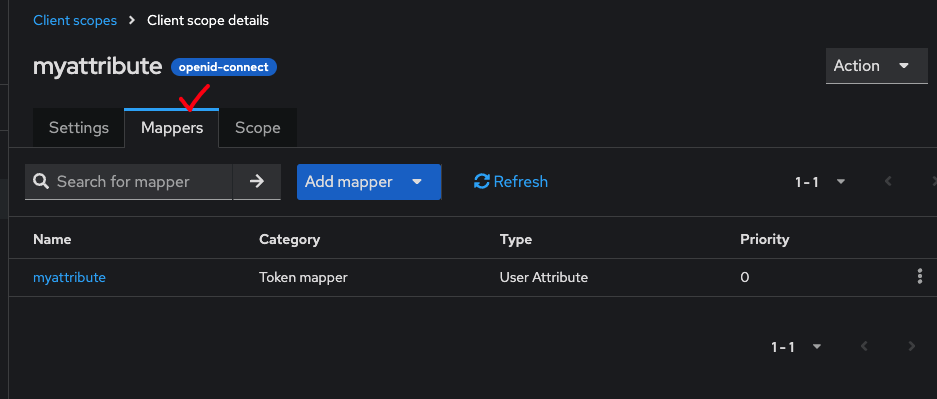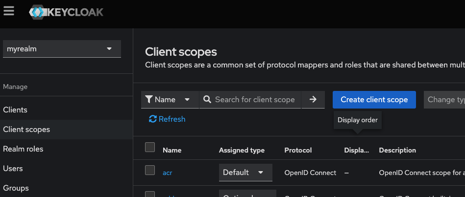 3. Clients -> oidc-playground -> Client Scopes -> Add client scope -> myattribute를 선택하고 add를 클릭한다. 이후 Default | Optional 중 Optional을 선택한다. Optional의 경우 클라이언트가 해당 범위를 명시적으로 요청해야만 한다.