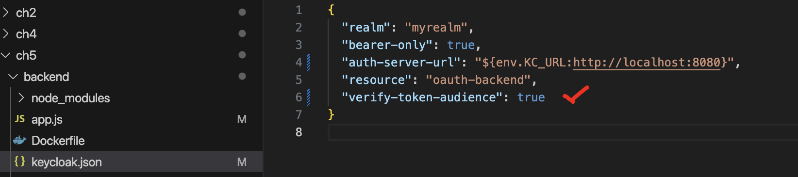 백엔드가 토큰의 audience 값을 확인하도록 on/off 하는 설정값은 backend/keycloak.json의 verify-token-audience 항목에서 확인할 수 있다.