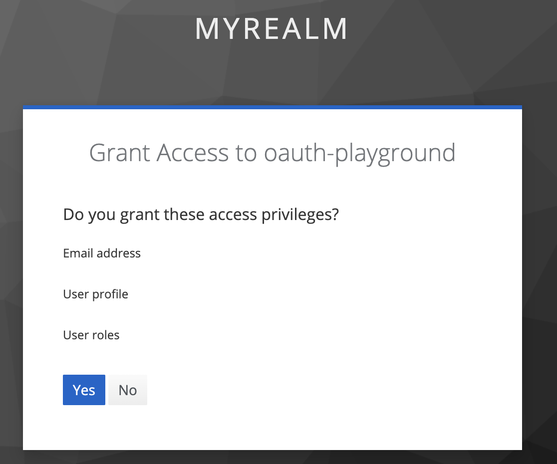 일반적으로 외부 애플리케이션의 경우 항상 사용자의 동의가 필요하지만, 관리자가 잘 알고 있는 애플리케이션의 경우 사용자의 동의 요청을 생략할 수 있다. clients -> oauth playground -> login settings 항목에 보면 consent required 속성이 있다. 이 속성을 켜고 다시 oauth playground로 돌아가서 2. authorization 을 진행해보자. 그럼 아래처럼 사용자 동의 요청 화면이 뜬다.