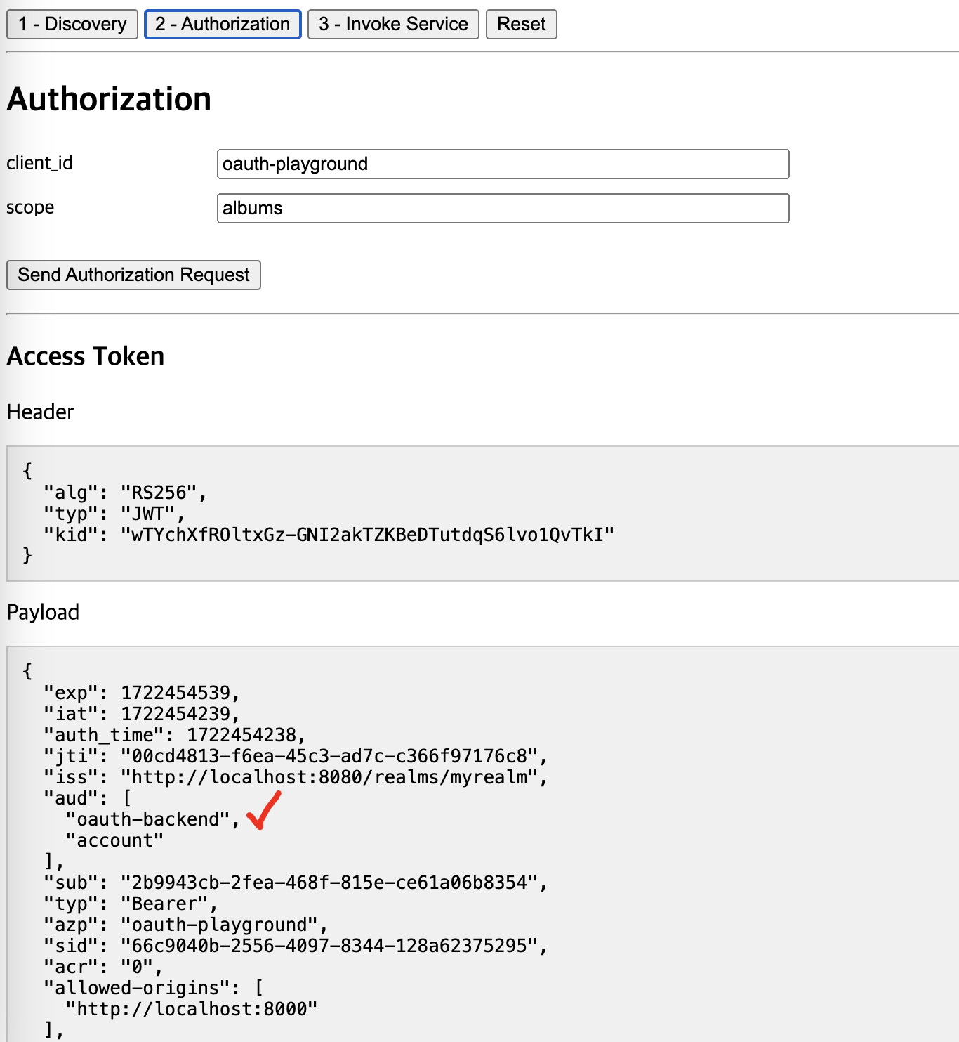 이후 oauth-playground 클라이언트에서 받아오는 토큰의 "aud" 값에 oauth-backend가 추가되면 백엔드에서 audience를 확인하여 접근 가능 여부를 판단하고 제한을 거는 방식이다.