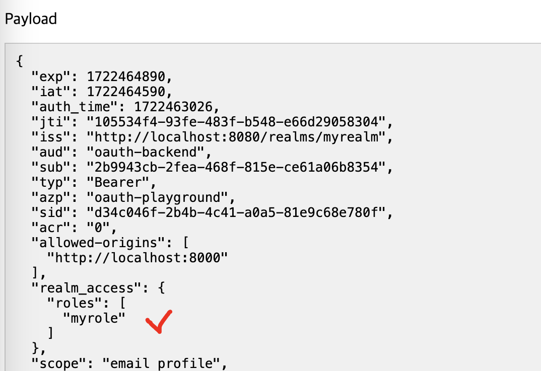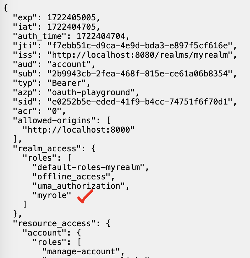그럼 Authorization 요청 시, realm_access 항목에 글로벌 realm role인 myrole이 추가된 것을 볼 수 있다.