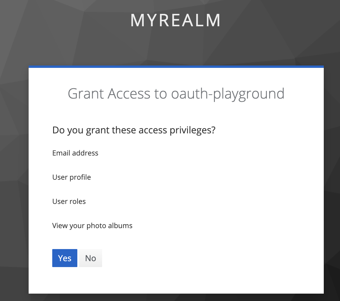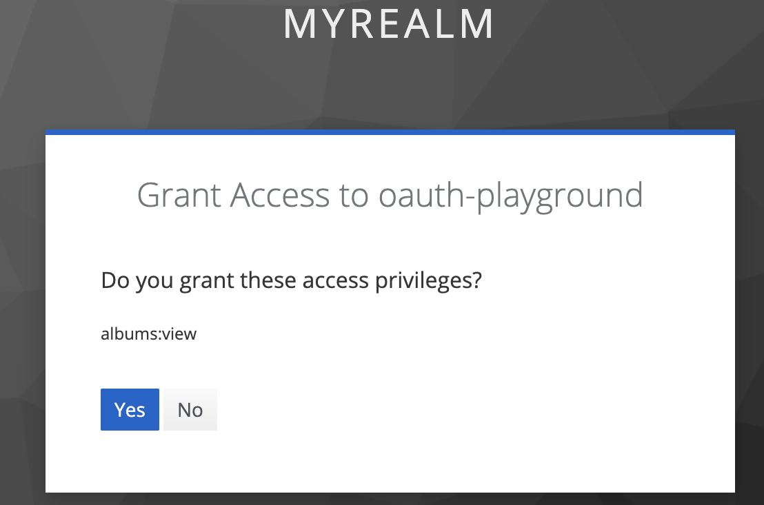 다음으로 다시 myrealm의 사용자로 로그인을 시도하면 아래와 같이 사용자 동의 제공 화면이 출력되는 것을 볼 수 있다.
