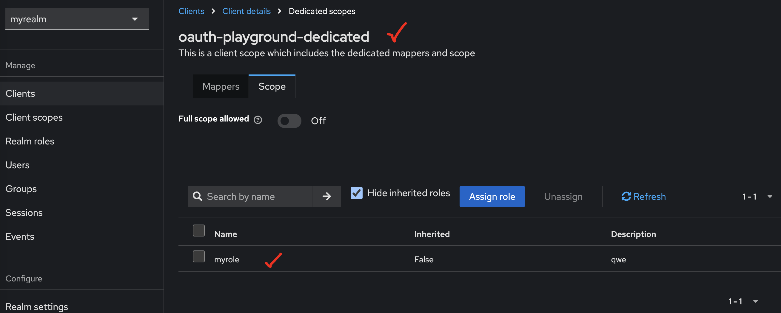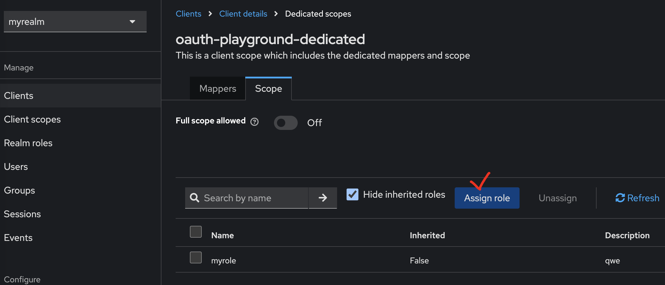 이제 myrole을 추가해본다. clients -> oauth playground -> client scopes -> oauth playground-dedicated -> roles 탭에서 assign role을 클릭하고 myrole을 추가한다. myrole 검색이 잘 안되면 필터를 Filter by realm roles로 변경해주면 된다.