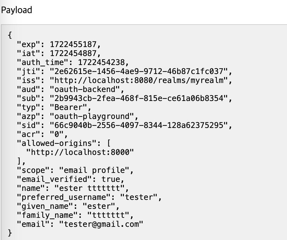 Full Scope Allowed 옵션이 켜진 상태라면 아래처럼 realm_access : role 및 resource_access: role 부분에 사용자가 가진 모든 role들이 존재하는 것을 볼 수 있다.