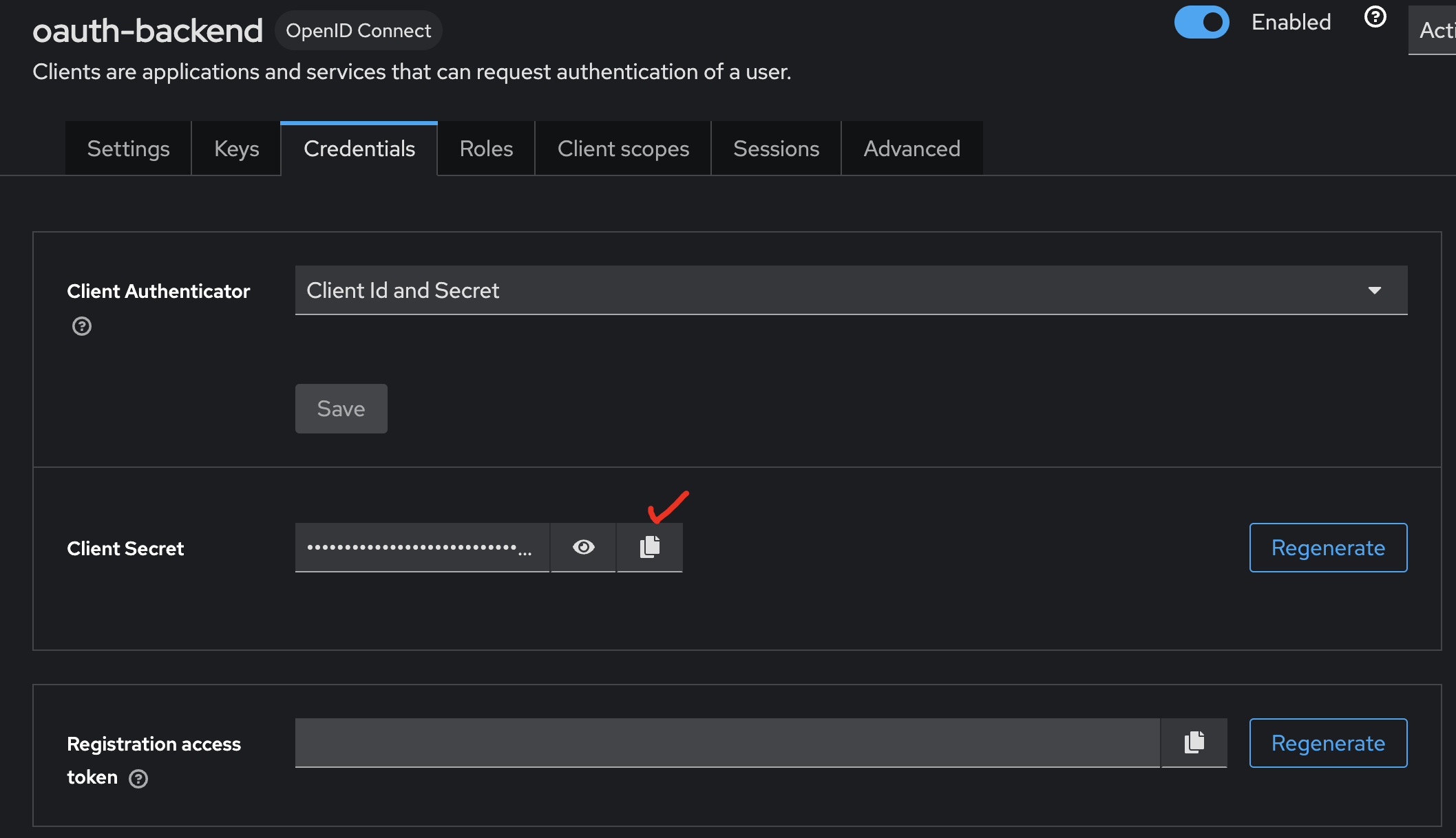oauth-backend의 자격 증명 및 인코딩된 접근 토큰이 필요하다. credentials 탭에 가서 해당 클라이언트의 secrets를 복사해와야하는데, credentials 탭을 띄울려면 settings -> Capability config -> client authentication 항목을 ON 해줘야한다.