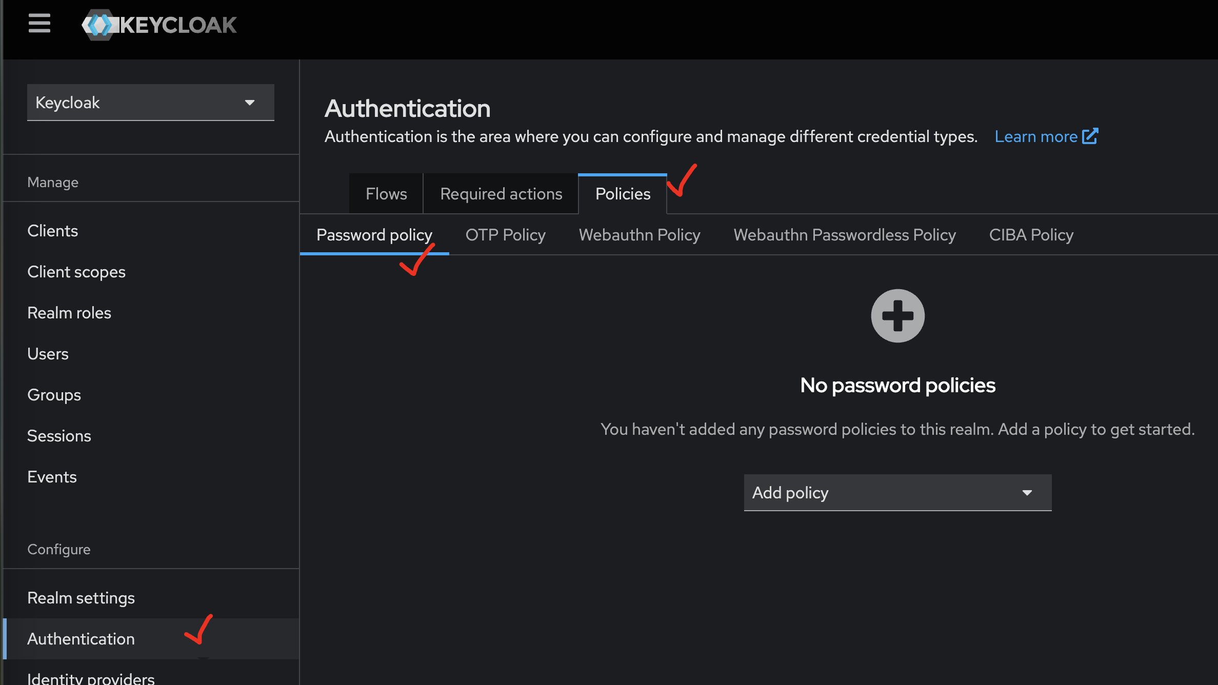 Authentication -> Policies -> Password Policy에서 정책을 만들 수 있다.