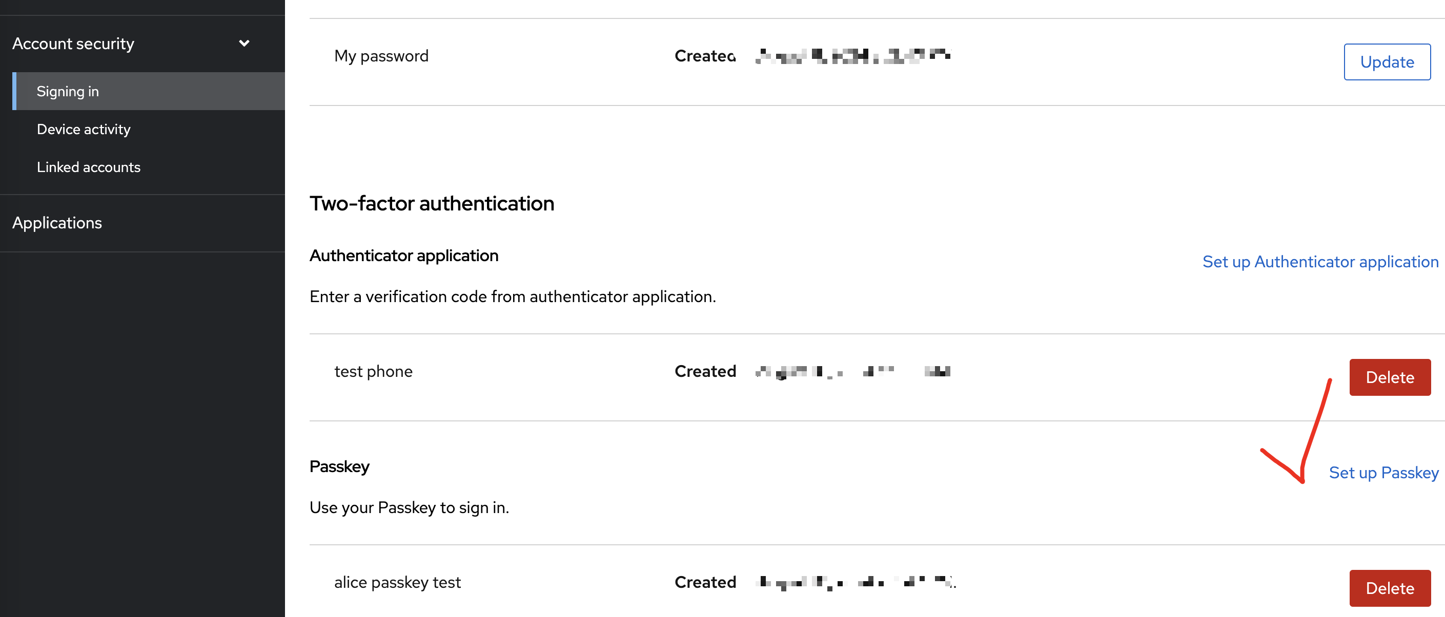 위에서 WebAuthn 과정을 추가하면 바로 로그인 시 진행되지는 않는다. 사용자가 WebAuthn용 PassKey 기기를 등록해야한다. OTP 기기를 등록할때와 마찬가지로 Signing In -> Two-factor authentication -> Passkey 항목에서 Set up passkey를 눌러서 등록할 수 있다.