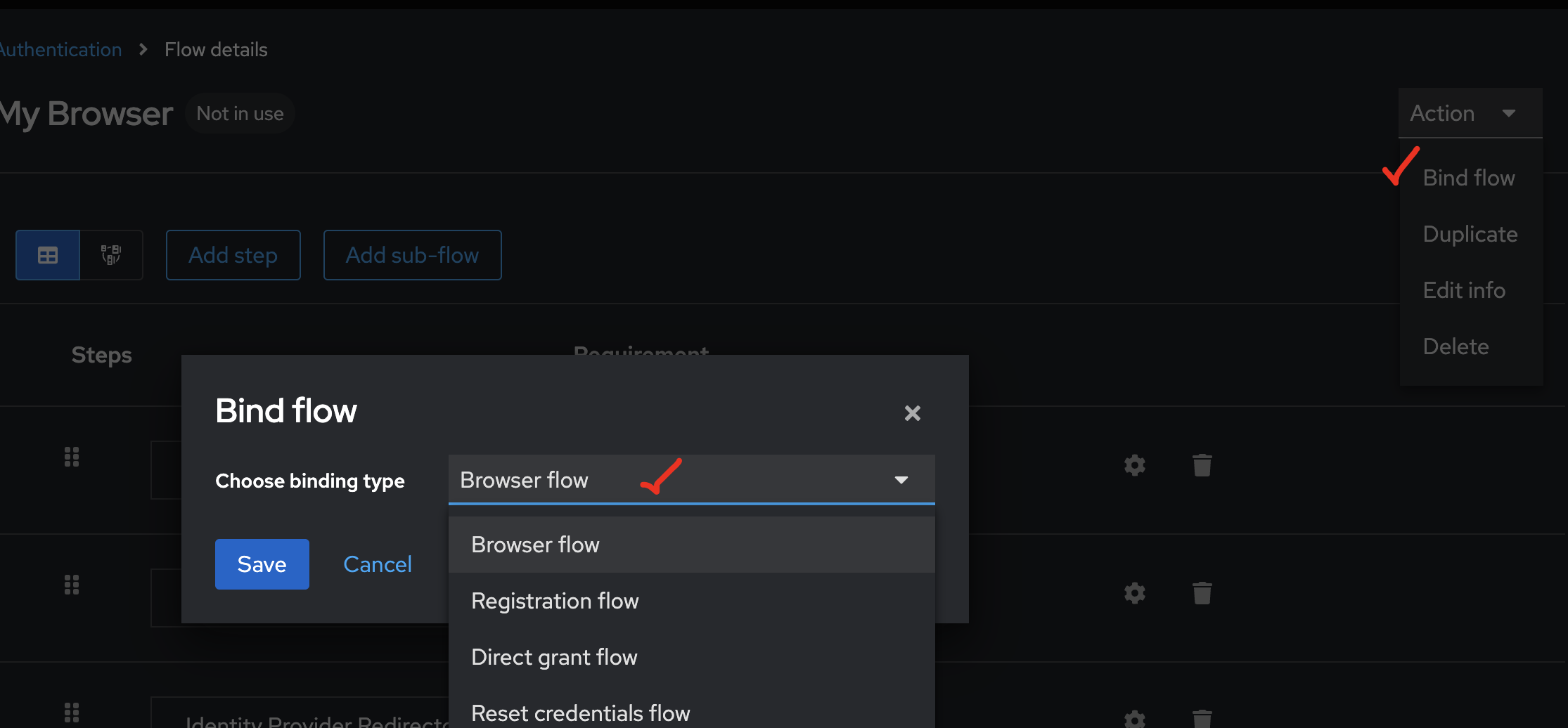 그리고 action -> Bind Flow에 들어가서 Browser flow를 선택한다. 기본 browser flow를 My Browser flow로 변경하는 것이 된다.