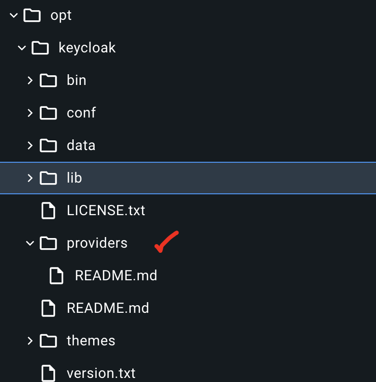 Keycloak은 JAR로 패키징된 사용자 정의 제공자를 사용한다. 이외에 Keycloak이 런타임에 사용자 정의 제공자를 검색하고 초기화할 수 있도록 service descriptor 파일도 포함해야한다. service descriptor 파일은 JAR 파일 내 META-INF/services 디렉터리에 있다.