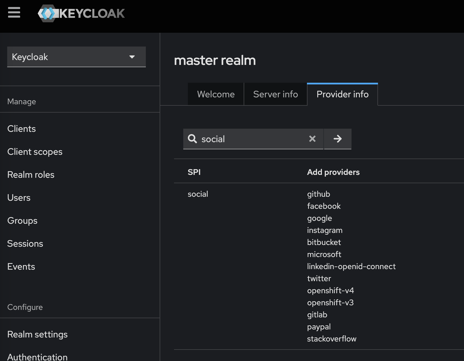 spi 목록을 확인하기 위해서는 관리 콘솔의 홈페이지 부분에서 Provider Info 부분을 살펴보면 된다. 아래 그림처럼 social 이라는 검색어를 입력해보면 Keycloak에 social SPI를 적용할 수 있는 Provider가 어떤 종류들이 있는지 확인할 수 있다.