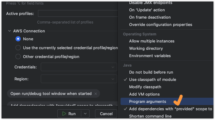 여기서 args.getNonOptionArgs()는 자바 프로그램을 실행할 때 COMMAND 인자로 주는 값이다. 또는 Intellij에서 아래처럼 Run Configuration에서 줄 수 있는 Program argument다.